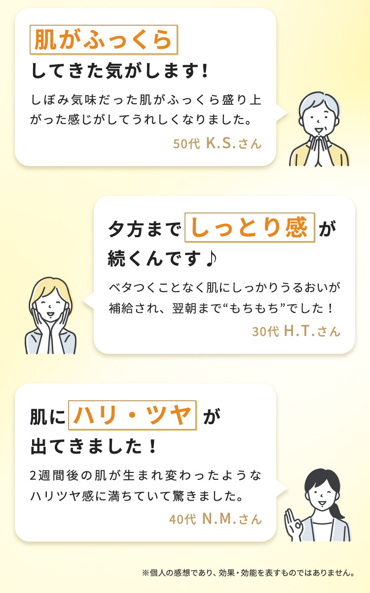 全成分成分名 配合目的 水 溶剤 グリセリン 保湿・湿潤剤 DPG 保湿・湿潤剤 ペンチレングリコール 保湿・湿潤剤 プロパンジオール 保湿・湿潤剤 ジ酢酸ジペプチドジアミノブチロイルベンジルアミド 保湿・湿潤剤 パルミトイルジペプチド-5ジアミノブチロイルヒドロキシトレオニン 保湿・湿潤剤 パルミトイルトリペプチド-5 保湿・湿潤剤 ポリ(トリペプチド-6) 保湿・湿潤剤 水溶性コラーゲン 保湿・湿潤剤 加水分解コラーゲン 保湿・湿潤剤 サクシノイルアテロコラーゲン 保湿・湿潤剤 水溶性コラーゲンクロスポリマー 保湿・湿潤剤 加水分解ヒアルロン酸 保湿・湿潤剤 カルボキシメチルヒアルロン酸Na 保湿・湿潤剤 アセチルヒアルロン酸Na 保湿・湿潤剤 ヒアルロン酸ヒドロキシプロピルトリモニウム 保湿・湿潤剤 ヒアルロン酸Na 保湿・湿潤剤 加水分解エラスチン 保湿・湿潤剤 セラミドAP 保湿・湿潤剤 セラミドNG 保湿・湿潤剤 セラミドNP 保湿・湿潤剤 セラミドEOP 保湿・湿潤剤 水溶性プロテオグリカン 保湿・湿潤剤 セイヨウハッカ葉エキス 保湿・湿潤剤 ダマスクバラ花エキス 保湿・湿潤剤 アロエベラ葉エキス 保湿・湿潤剤 アルニカ花エキス 保湿・湿潤剤 ダイズ種子エキス 保湿・湿潤剤 ビルベリー葉エキス 保湿・湿潤剤 メリッサ葉エキス 保湿・湿潤剤 シソ葉エキス 保湿・湿潤剤 ゴレンシ葉エキス 保湿・湿潤剤 メマツヨイグサ種子エキス 保湿・湿潤剤 ナツメ果実エキス 保湿・湿潤剤 乳酸桿菌/ローヤルゼリー発酵液 保湿・湿潤剤 モウソウチクたけのこ皮エキス 保湿・湿潤剤 デュナリエラサリナエキス 保湿・湿潤剤 BG 保湿・湿潤剤 ベタイン 保湿・湿潤剤 エチルヘキシルグリセリン 保湿・湿潤剤 水添レシチン 保湿・湿潤剤 パンテノール 保湿・湿潤剤 フィトステロールズ 保湿・湿潤剤 トリフルオロ酢酸テトラデシルアミノブチロイルバリルアミノ酪酸ウレア 保湿・湿潤剤 シクロペンタシロキサン エモリエント剤 ラウロイルグルタミン酸ジ(フィトステリル/オクチルドデシル) エモリエント剤 エチルヘキサン酸セチル エモリエント剤 塩化Mg 皮膚コンディショニング剤(未分類) PEG-60水添ヒマシ油 乳化剤 (アクリレーツ/アクリル酸アルキル(C10-30))クロスポリマー 親水性増粘剤 オリーブ油PEG-7カルボン酸Na 界面活性助剤 PVP 皮膜形成剤 EDTA-2Na キレート剤 水酸化Na pH調整剤 クエン酸 pH調整剤 クエン酸Na pH調整剤 フェノキシエタノール 防腐剤
