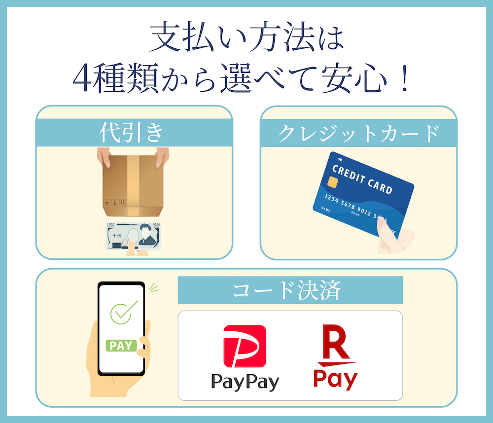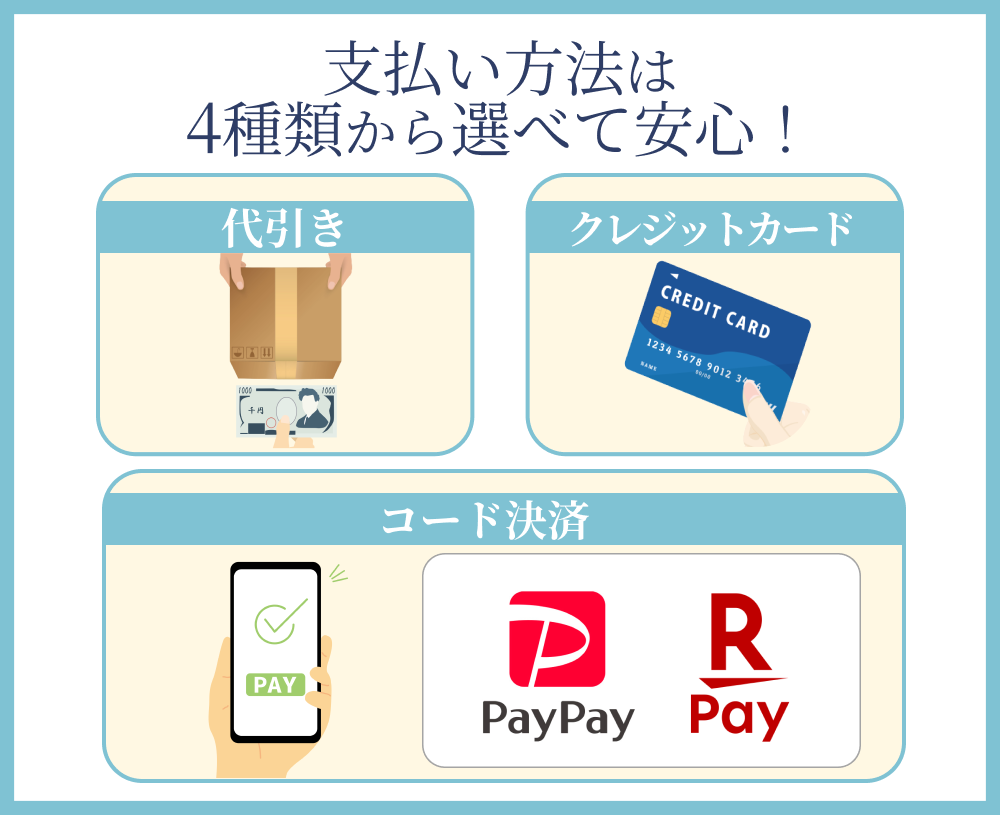 お支払は、着払い(代引き)とクレジットカード払い、コード決済が選択可能です。